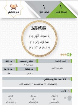 التعرف على الاستعاذة والبسملة، ثم الغوص في سور قصيرة ومركزية: " الفاتحة، الناس، الفلق، الإخلاص، المسد، النصر، الكافرون".